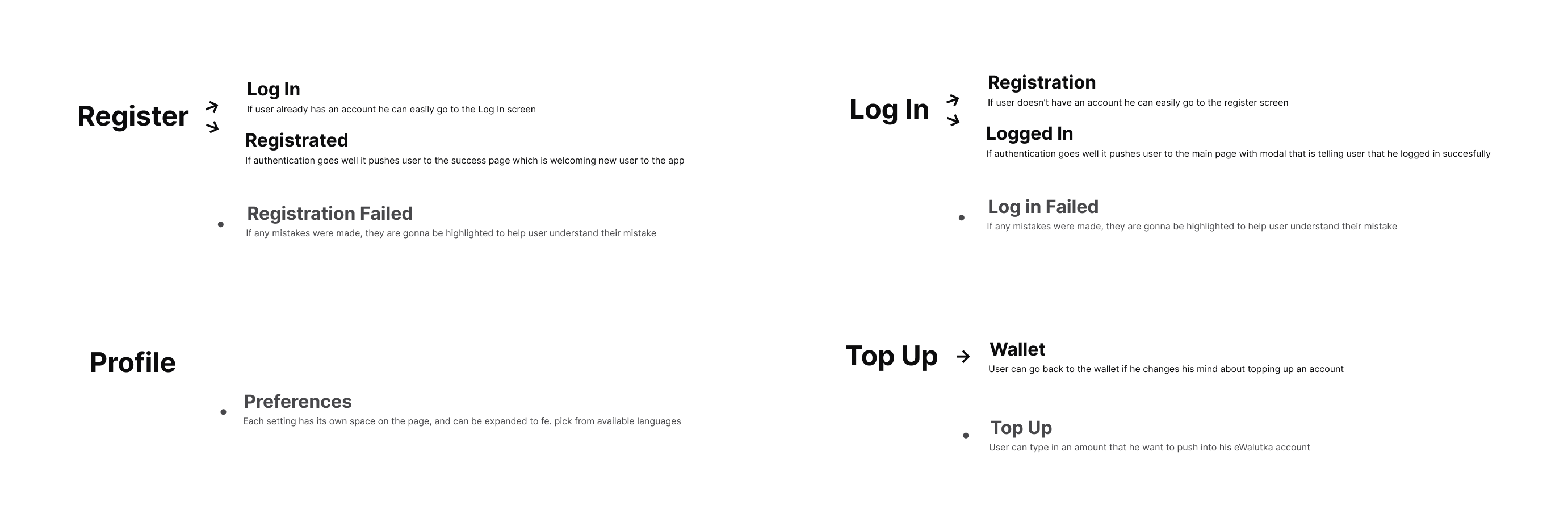 Zająłem się więc zaprojektowaniem Breadboardów - wszystkich możliwych ścieżek z poszczególnych ekranów, tak aby użytkownik mógł w łatwy sposób dostać się tam gdzie tego potrzebuje. W aplikacji wykorzystuje tab navigation, co już znacznie ułatwia przemieszczanie się pomiędzy ekranami, a linki w dobrych miejscach jedynie podpowiadają co i gdzie zrobić jako następny krok. Na tym etapie dodałem np. ...