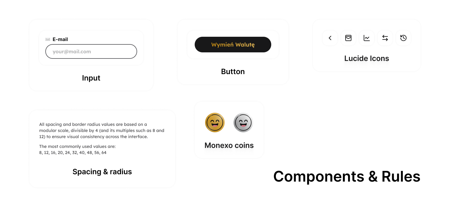 Interfejs aplikacji został zaprojektowany w estetyce minimalistycznej, z jedną główną akcją użytkownika — „Wymień walutę”. A kolorystyka i typografia wspierają czytelność, spokój oraz poczucie bezpieczeństwa, co jest kluczowe w produktach FinTech.