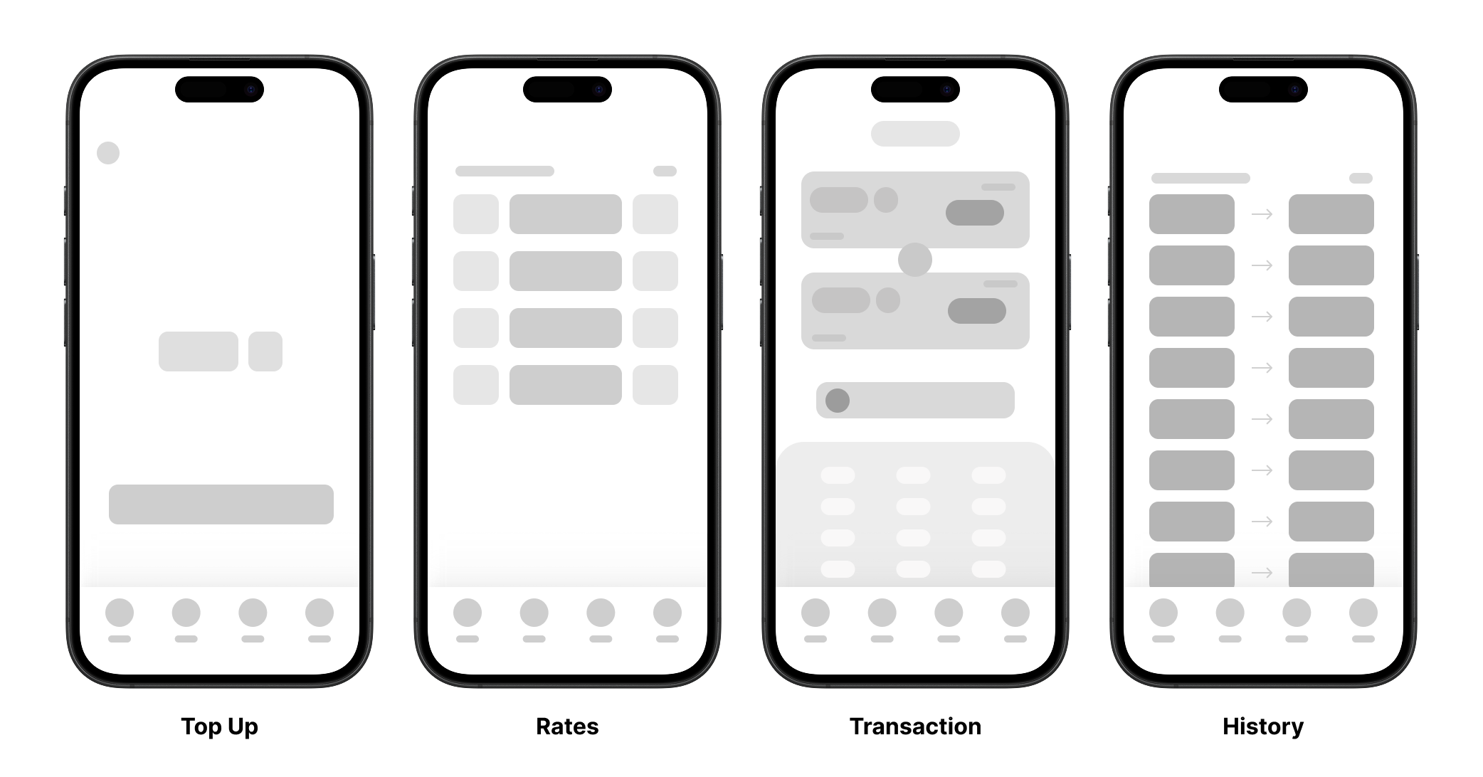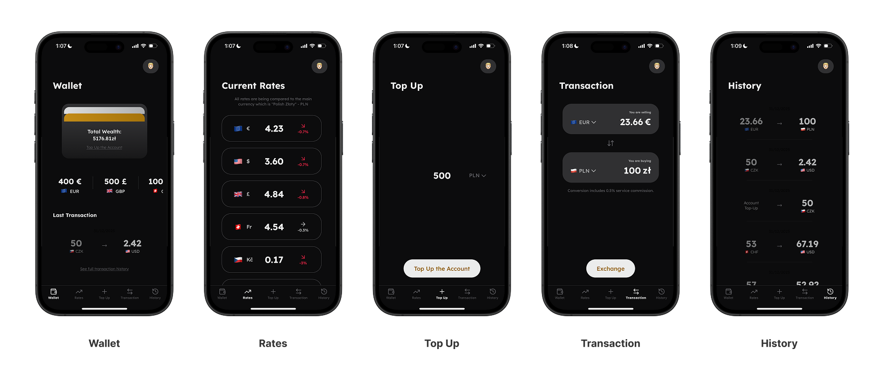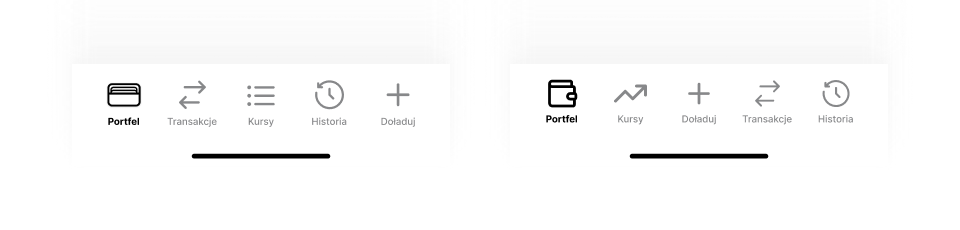 Dodatkowo zoptymalizowałem nawigację pod najczęstszy scenariusz użycia (sprawdzenie kursu → doładowanie → wymiana), skracając czas realizacji celu poprzez ustawienie kart w kolejności najczęściej powtarzanego flow. Oraz podmieniłem niektóre ikony na bardziej intuicyjne odpowiedniki tak, aby użytkownik jeszcze szybciej i łatwiej dostawał się w porządane miejsce.
