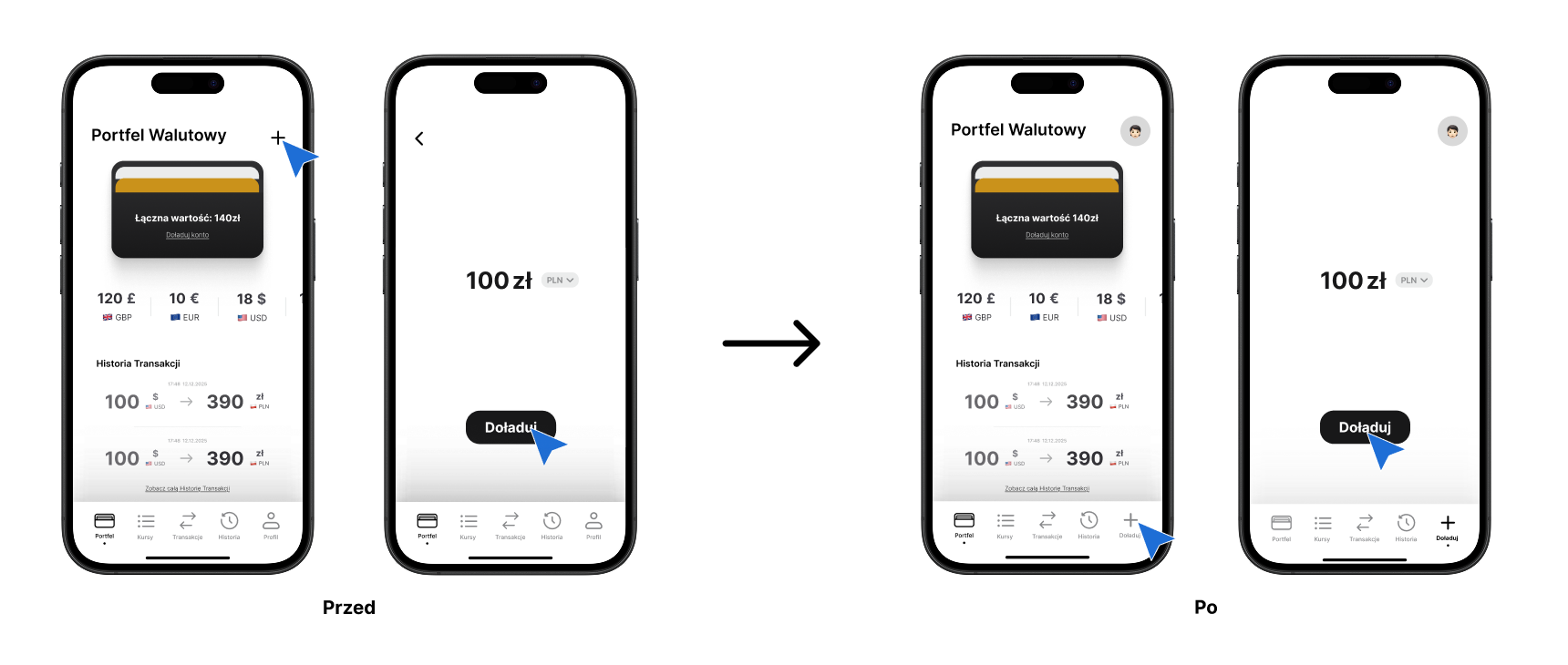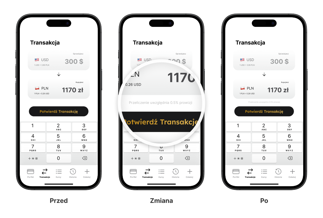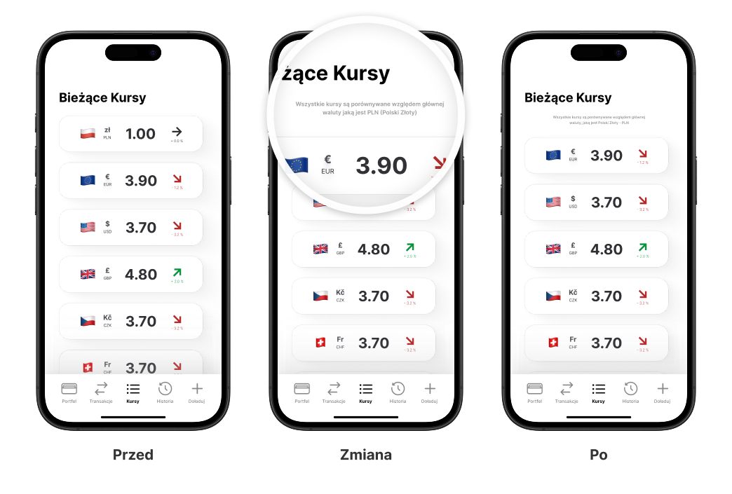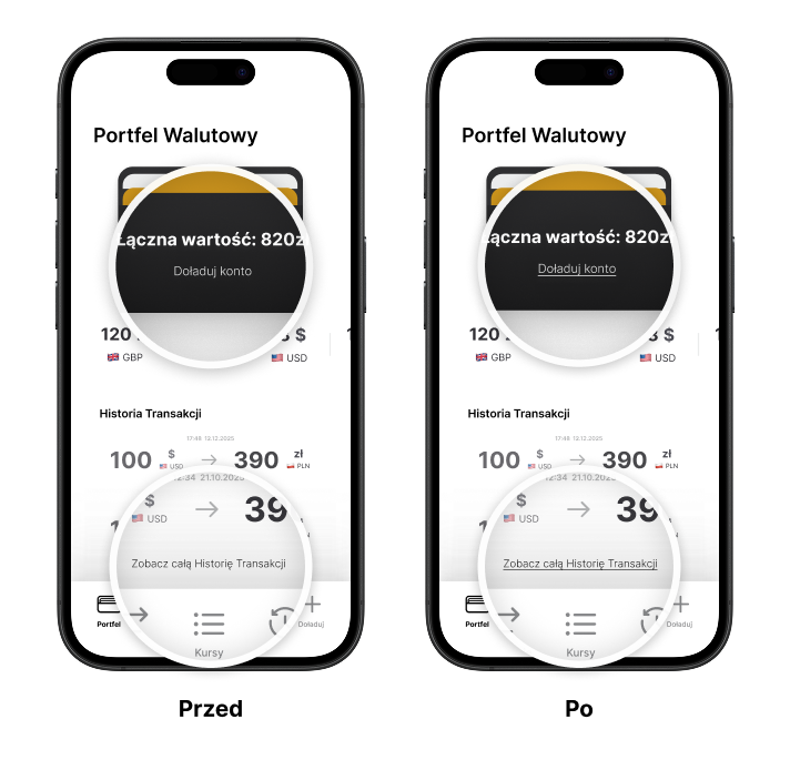 Zmiana ta znacząco skróciła ścieżkę do wykonania transakcji oraz uczyniła interfejs bardziej intuicyjnym. Po iteracji użytkownicy bez dodatkowych wskazówek potrafili szybko zasilić konto i przejść do wymiany walut.