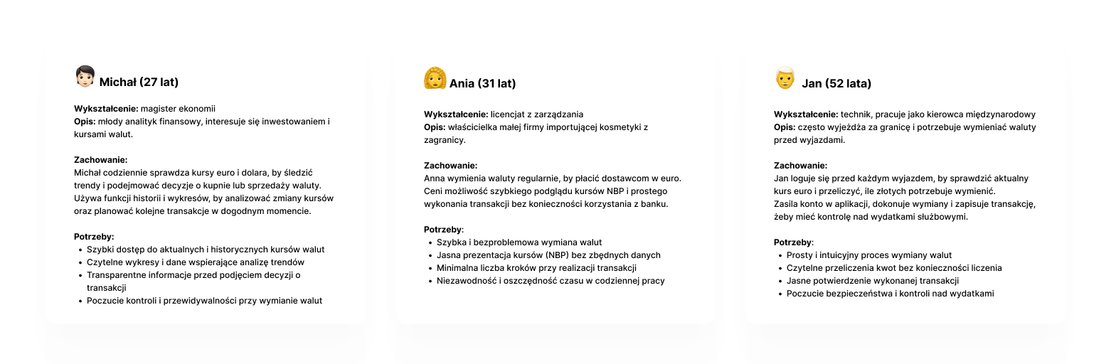 Kształtowanie produktu rozpocząłem od stworzenia trzech person dla naszego produktu. To pokazało mi, że