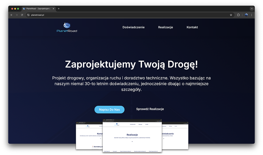 Nowa strona internetowa firmy PlanetRoad, którą zaprojektowałem w celu uproszczenia klientom poznania firmy, prezentacji dotychczasowych realizacji w czytelny i atrakcyjny sposób oraz ułatwienia kontaktu z firmą