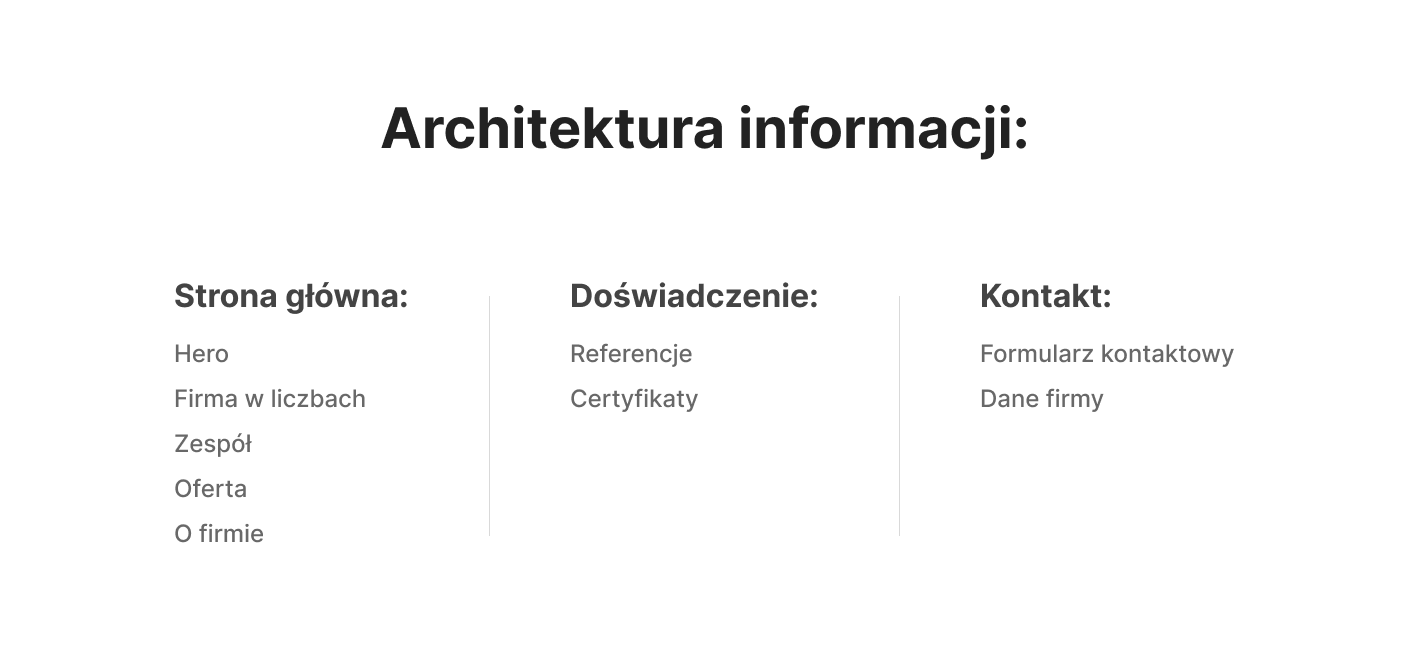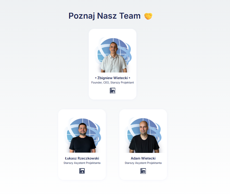 Aby rozwiązać te problemy, w pierwszej iteracji stworzyłem sekcję Hero od zera, a także rozszerzyłem stronę główną o dwie nowe sekcje: prezentację zespołu (przygotowanie i obróbka zdjęć) oraz doświadczenie firmy w liczbach (podliczenie statystyk firmowych). Równolegle wydzieliłem także, dwie nowe podstrony „Kontakt”, który wcześniej był jedynie linkiem i „Doświadczenie”, przenosząc formularz kontaktowy ze strony głównej oraz dodając pierwsze referencje z wcześniejszych projektów.