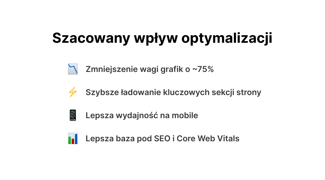W ramach tej iteracji przeprowadziłem gruntowną optymalizację techniczną: konwersję zdjęć do formatu WebP, poprawę struktury HTML, optymalizację ładowania zasobów oraz korekty SEO na stronie aby zadbać o pozycjonowanie w google.