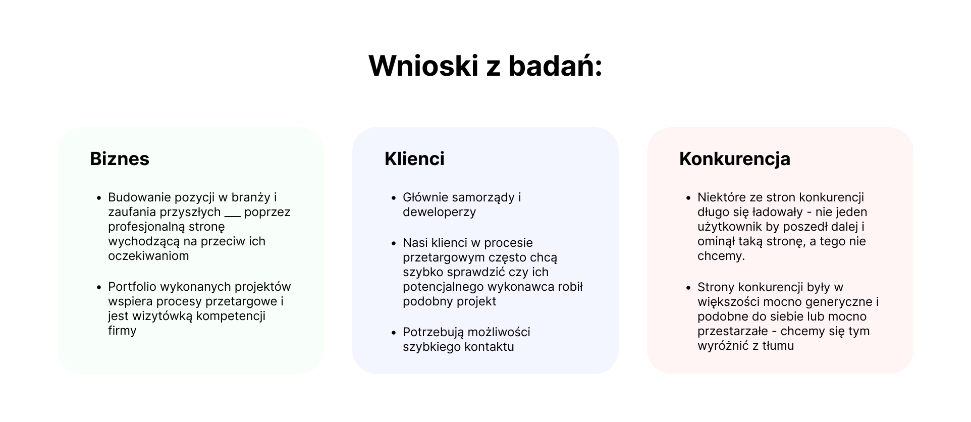 Kolejno zbadałem oczekiwania użytkowników i najczęściej wyszukiwane informacje o firmach z branży, aby zapewnić użyteczność nowej strony internetowej pod kątem UX i SEO. Analiza treści pokazała, że kluczowe są: przejrzysta oferta, szybki kontakt oraz portfolio poprzedncih projektów.