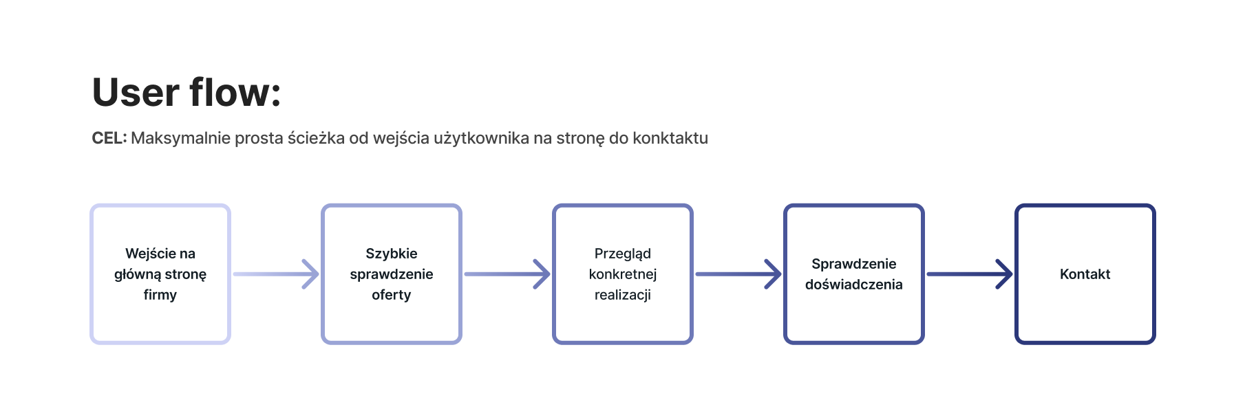 Potem przeszedłem do analizy ścieżki użytkownika, która pozwoliła mi lepiej zrozumieć, jakie działania podejmuje potencjalny klient od momentu wejścia na stronę do skontaktowania się z firmą. Zmapowanie tych etapów umożliwiło mi zaplanowanie logicznej i intuicyjnej struktury strony — tak, aby użytkownik mógł łatwo odnaleźć informacje o usługach, przeglądać realizacje i bezproblemowo przejść do sekcji kontaktu.